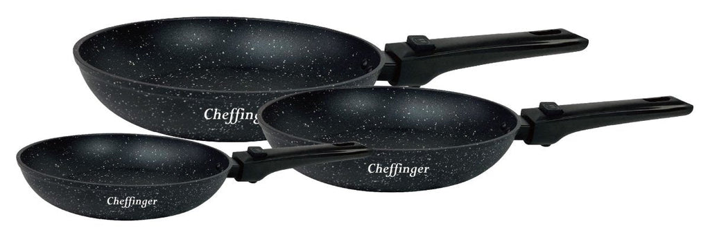 Bespaar ruimte zonder in te leveren op kwaliteit met de Cheffinger 3-delige Koekenpannenset met Afneembare Handgreep – Zwart. Deze slimme set, bestaande uit pannen van Ø20, Ø24 en Ø28 cm, is ideaal voor elk gerecht – van een snel ontbijtje tot een volledige maaltijd. Dankzij de afneembare handgrepen stapel je de pannen eenvoudig op, perfect voor keukens met beperkte kastruimte.