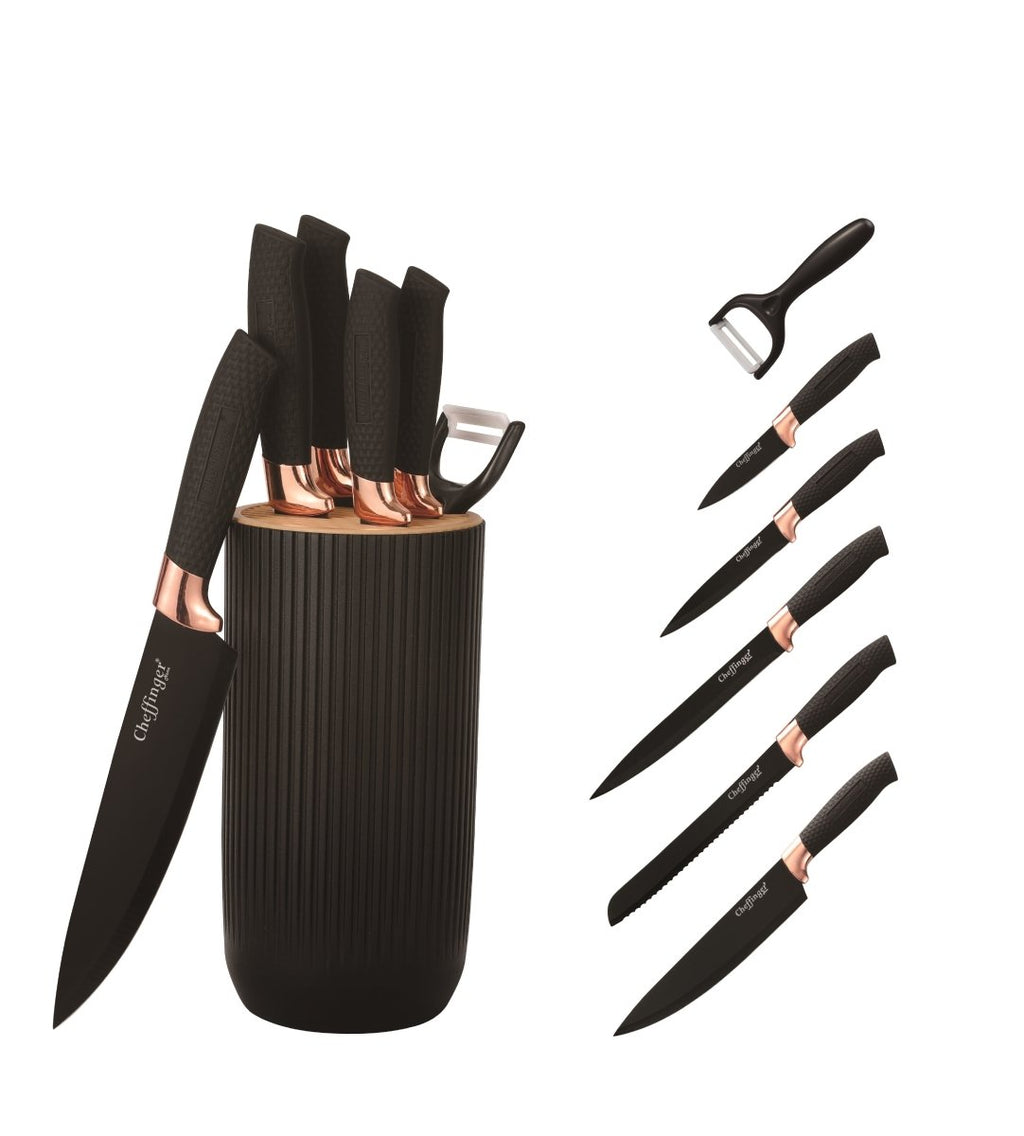 Breng luxe en precisie naar je keuken met de Cheffinger 7-delige Messenset met Standaard in stijlvol zwart met roségouden accenten. Deze elegante set combineert verfijnd design met professionele kwaliteit, waardoor elke snijtaak een plezier wordt. De messen zijn vervaardigd uit hoogwaardig roestvrij staal en voorzien van een antiaanbakcoating, waardoor je moeiteloos en hygiënisch werkt – ideaal voor zowel hobbykoks als professionals.