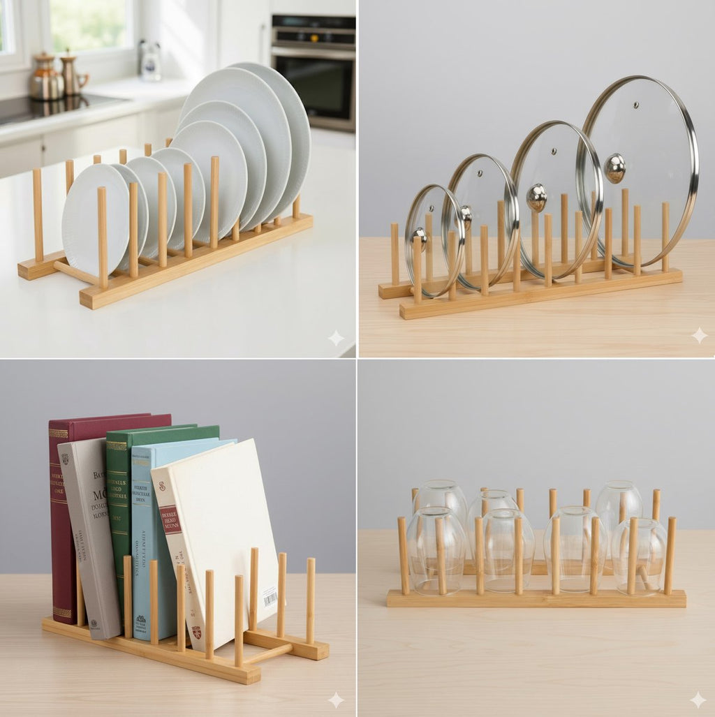 Breng orde en natuurlijke charme in je keuken met de Cheffinger bamboe bordenhouder. Dit praktische en stijlvolle rek is perfect voor het netjes opbergen of laten drogen van borden, deksels, kopjes of zelfs kookboeken. Gemaakt van duurzaam bamboe, combineert het milieuvriendelijkheid met stevigheid en een warme uitstraling die in elke keuken past.