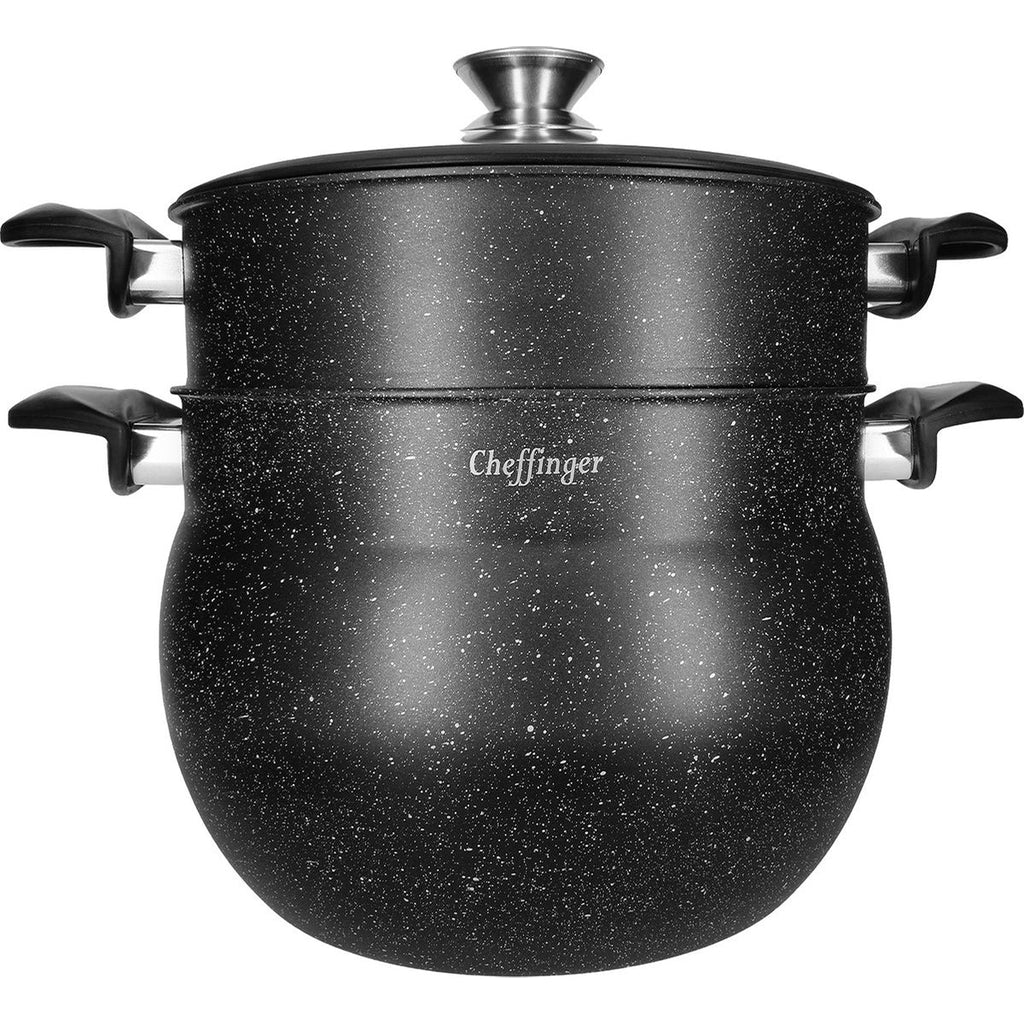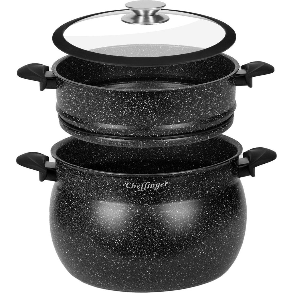 Ervaar gezond, smaakvol en veelzijdig koken met de Cheffinger Couscouspan – 8 liter – Ø24 cm. Deze ruime pan met stoominzet is ideaal voor het bereiden van couscous, maar ook perfect geschikt voor het stomen van groenten, vis, vlees en rijst. Dankzij de hoogwaardige marmeren antiaanbaklaag kook je zonder schadelijke stoffen zoals PFOA en heb je minder vet nodig – gezonder én gemakkelijker. De robuuste aluminium constructie met hittebestendige coating staat garant voor jarenlang kookplezier.