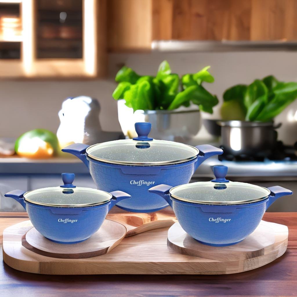 Laat je kookkunsten stralen met de Cheffinger Pannenset Crocodile Line – Blauw. Deze stijlvolle 6-delige set combineert luxe design met ultiem gebruiksgemak. De unieke krokodillenstructuur en de glanzend blauwe afwerking geven je keuken een moderne uitstraling, terwijl de hoogwaardige materialen zorgen voor perfecte kookresultaten, keer op keer. Met drie verschillende formaten pannen (20, 24 en 28 cm) inclusief glazen deksels, heb je voor elk gerecht de juiste pan binnen handbereik.