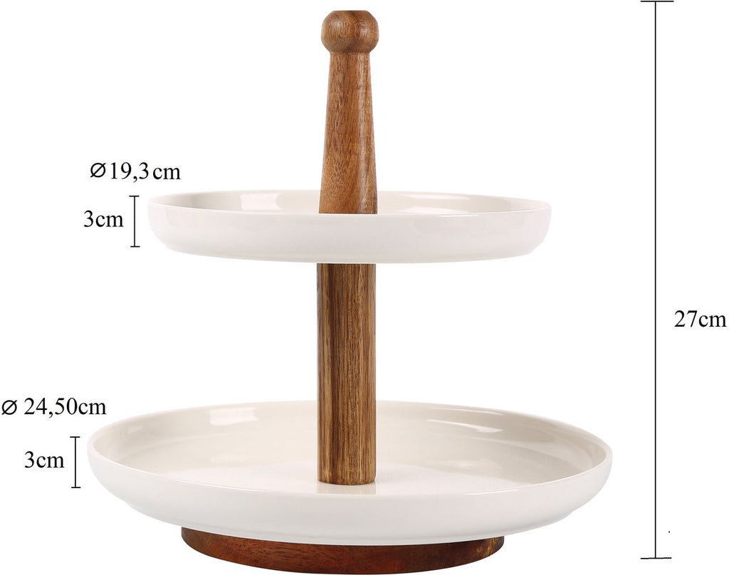 Breng elegantie en functionaliteit samen met de Cheffinger 2-laagse etagère van bamboe en keramiek. Deze stijlvolle serveerstandaard is perfect om taarten, fruit, gebak of snacks op een verfijnde manier te presenteren. Dankzij het tijdloze design wordt ze het stralende middelpunt van elke tafel – of het nu gaat om ontbijt, high tea, feest of buffet.