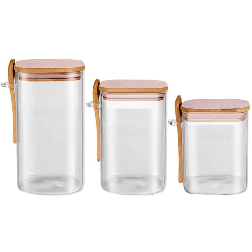 • Leveringsomvang: 3x glazen voorraadpotten, 3x bamboe deksels, 3x bamboe lepels
