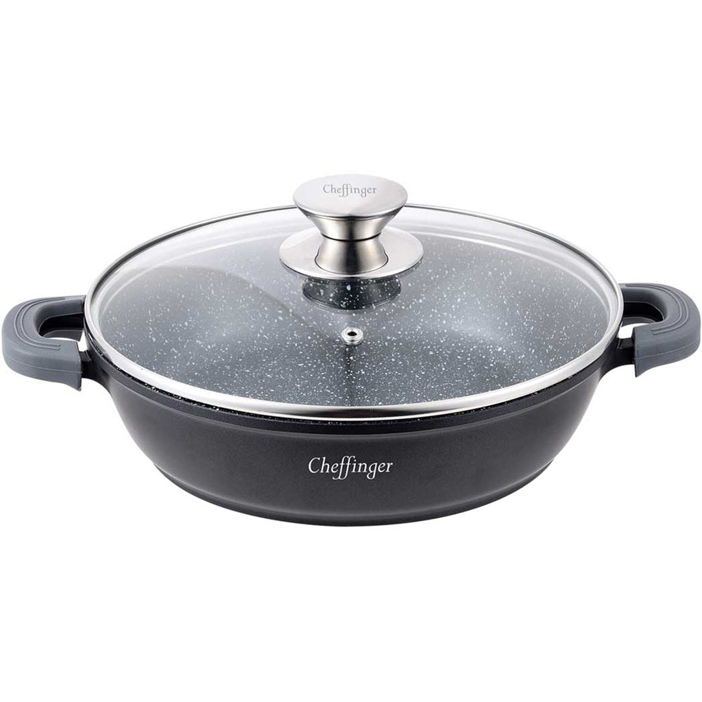 Maak kennis met de Cheffinger Lage Braadpan met Deksel – 40 cm, Zwart, de perfecte keuze voor wie groots wil koken. Met zijn royale formaat is deze pan ideaal voor het bereiden van ruime porties stoofschotels, vlees, groenten of pasta’s, of voor gezellige diners met familie en vrienden. Het stevige aluminium met antiaanbaklaag zorgt ervoor dat je gerechten niet aanbakken, terwijl de warmte gelijkmatig wordt verdeeld voor perfecte kookresultaten. Dankzij het glazen deksel houd je altijd zicht op je bereidingen en blijft smaak en vocht optimaal behouden.