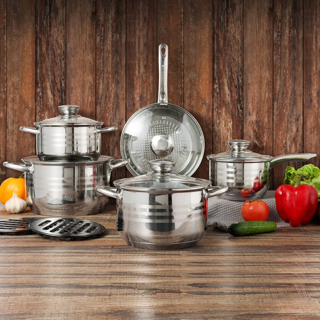 Duurzaam en veelzijdig – het 18/10 RVS is bestand tegen vervorming en blijft mooi, maaltijd na maaltijd. De antiaanbaklaag voorkomt dat voedsel aanbrandt en maakt schoonmaken eenvoudig, terwijl de set ook vaatwasmachinebestendig is voor extra gemak. Het elegante, gepolijste design voegt een moderne touch toe aan elke keuken.