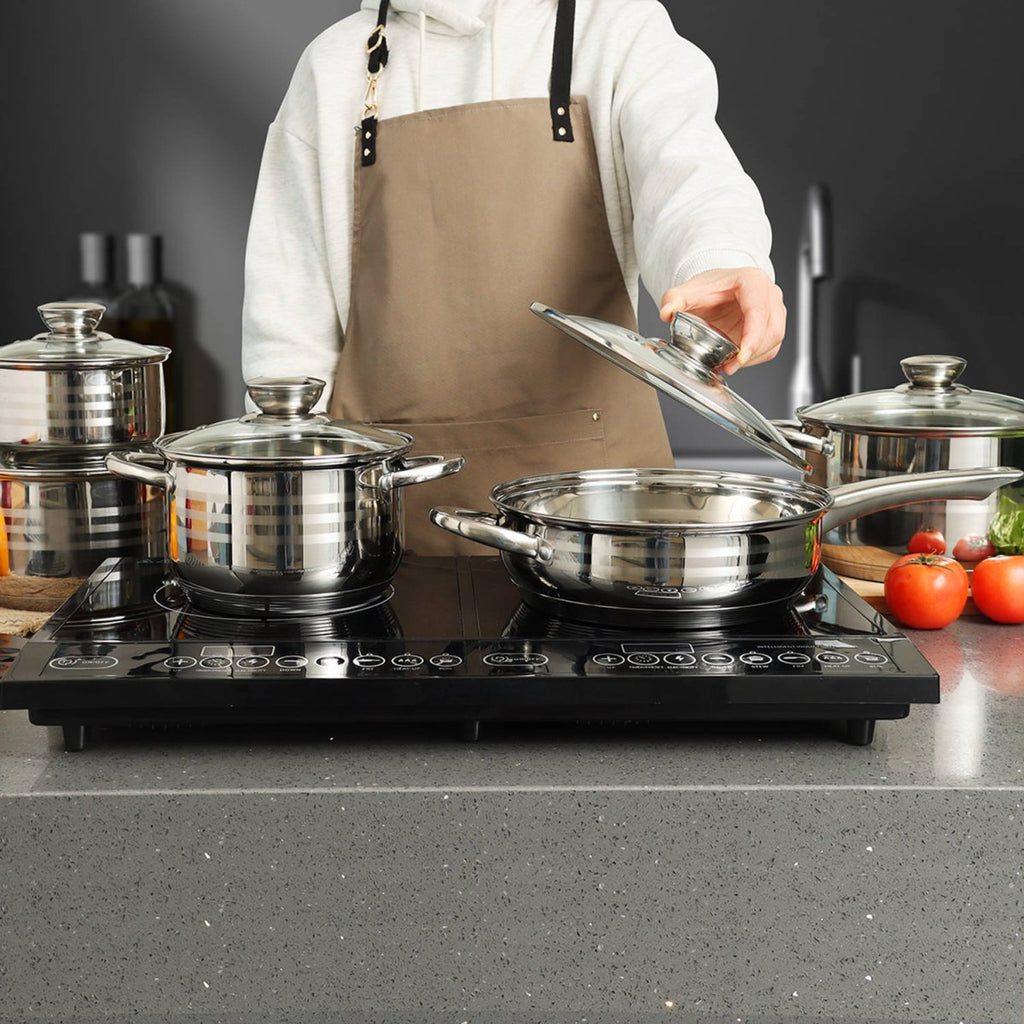 Ontdek de ongeëvenaarde kwaliteit van de Cheffinger Pannenset – jouw nieuwe partner voor elke kookuitdaging. Gemaakt van hoogwaardig 18/10 roestvrij staal, biedt deze complete set een perfecte combinatie van duurzaamheid, functionaliteit en elegantie. Met de 7-laagse thermische bodem geniet je van snelle en gelijkmatige warmteverdeling, waardoor koken niet alleen energiezuinig is, maar ook efficiënter. Of je nu kookt op gas, inductie of keramisch, deze set staat garant voor topprestaties op elke warmtebron.