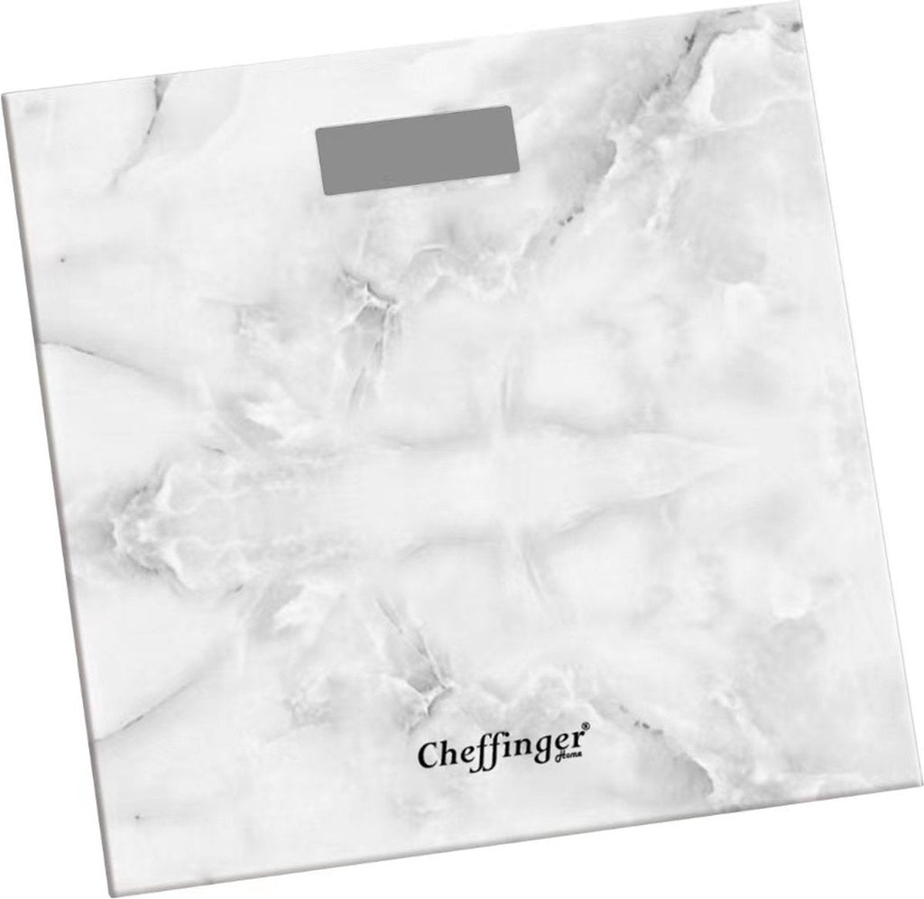 Ervaar stijl en precisie in één met de Cheffinger Personenweegschaal Marmer Wit – een digitale weegschaal met een strak design en handige functies voor dagelijks gebruik. Met een capaciteit tot 180 kg en een helder blauw LCD-display is deze weegschaal zowel functioneel als elegant, perfect passend in elke moderne badkamer of slaapkamer.