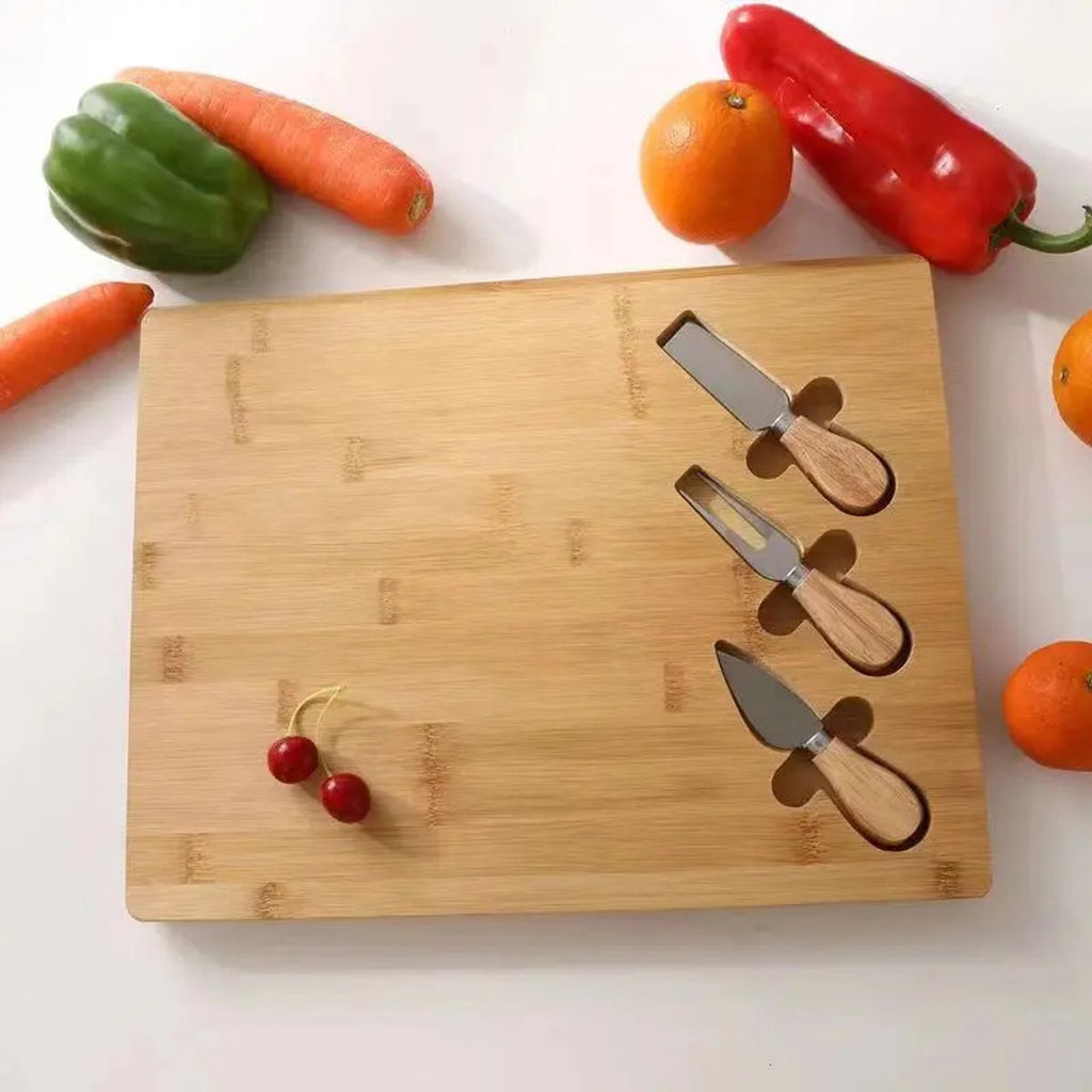 De drie bijgeleverde kaasmessen, elk met een ergonomisch houten handvat, maken het snijden van zowel zachte als harde kazen moeiteloos. De geïntegreerde uitsparingen houden de messen netjes op hun plek, zodat je altijd alles bij de hand hebt.